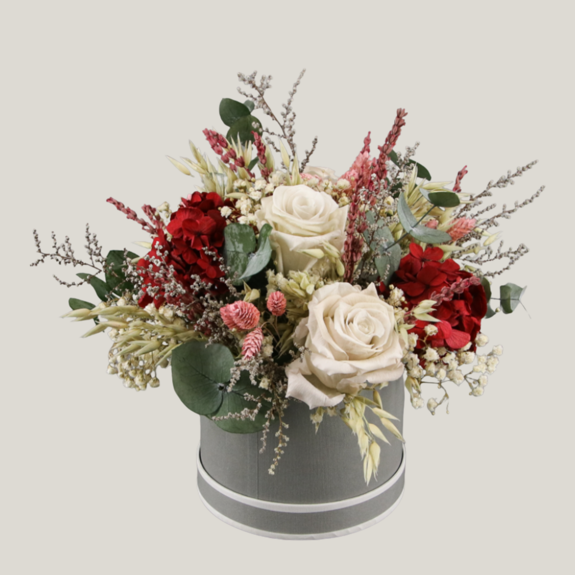 Offrez une touche d'éternité à votre bien-aimé(e) avec la boite à chapeau Syna. Les roses et hortensias stabilisés offrent une belle déclaration pour la Saint Valentin. Laissez vos sentiments perdurer grâce à ce cadeau unique.