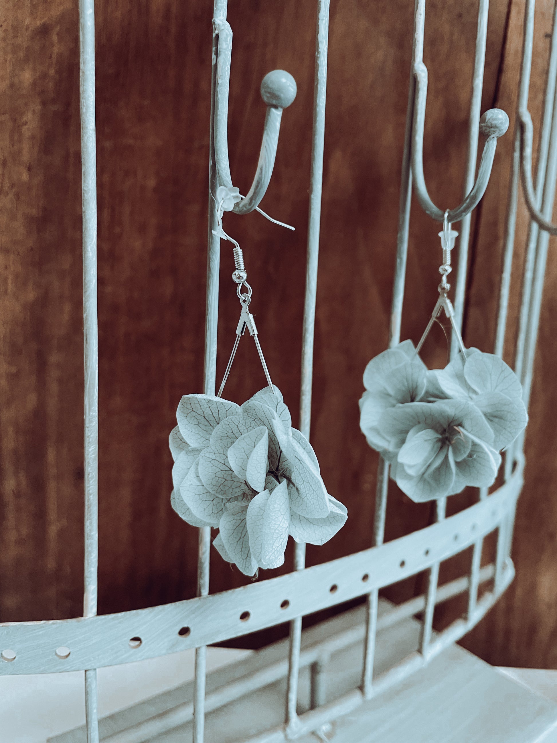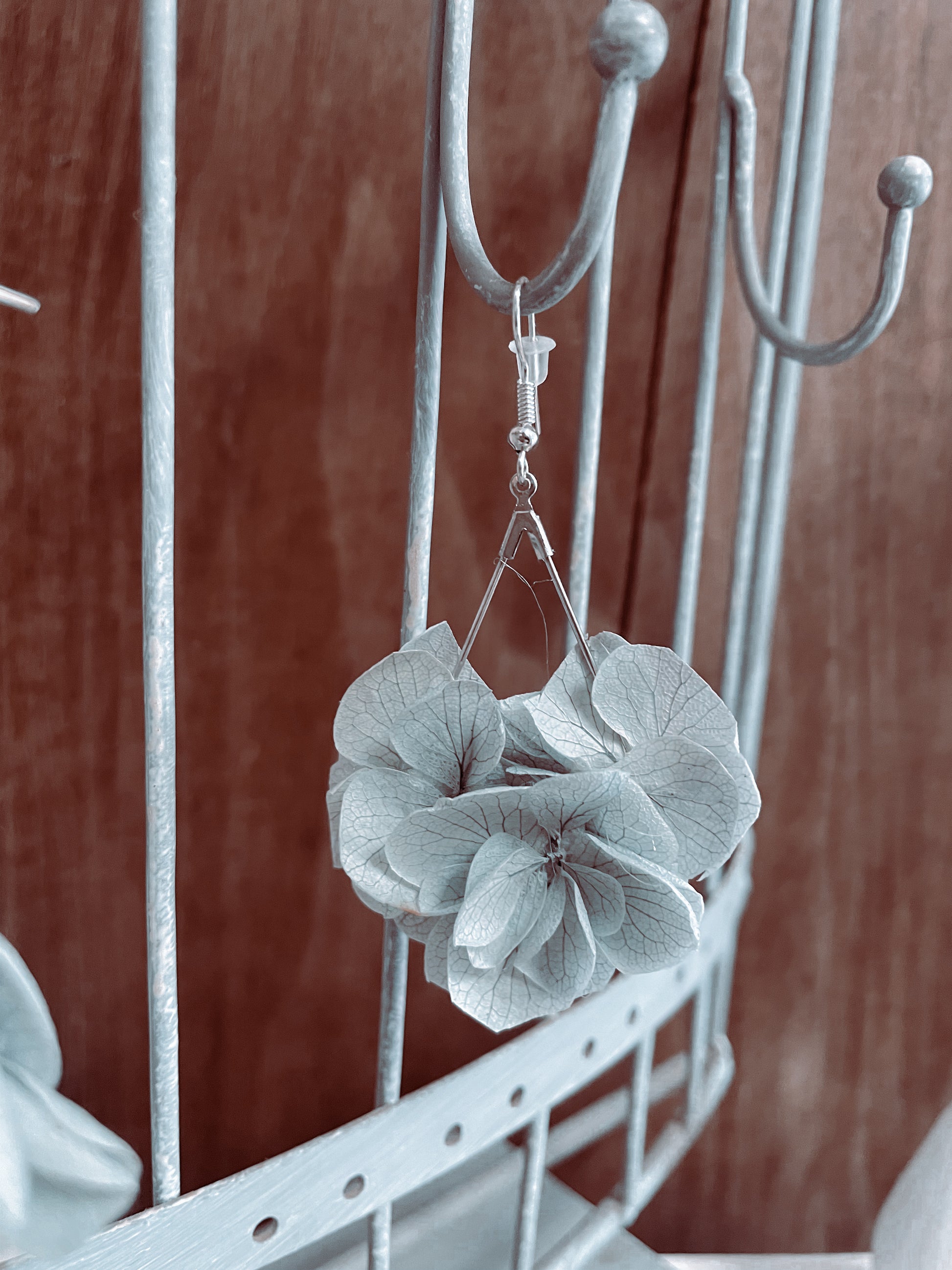 Boucle d'oreille triangulaire argentée avec de l'hortensia bleu ancien.