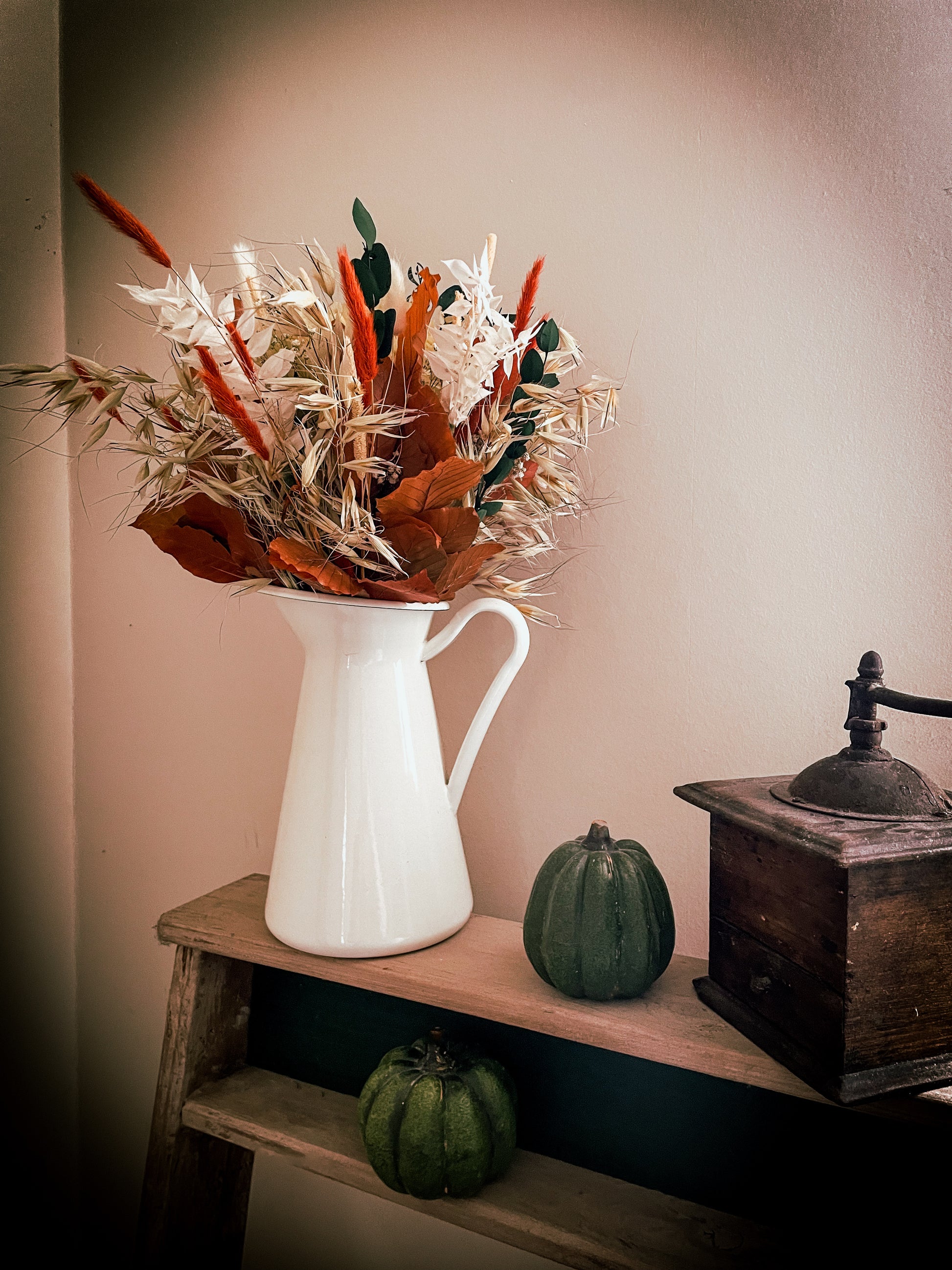 Délicate alliance de couleurs automnales, un bouquet de fleurs séchées tout en gaité.