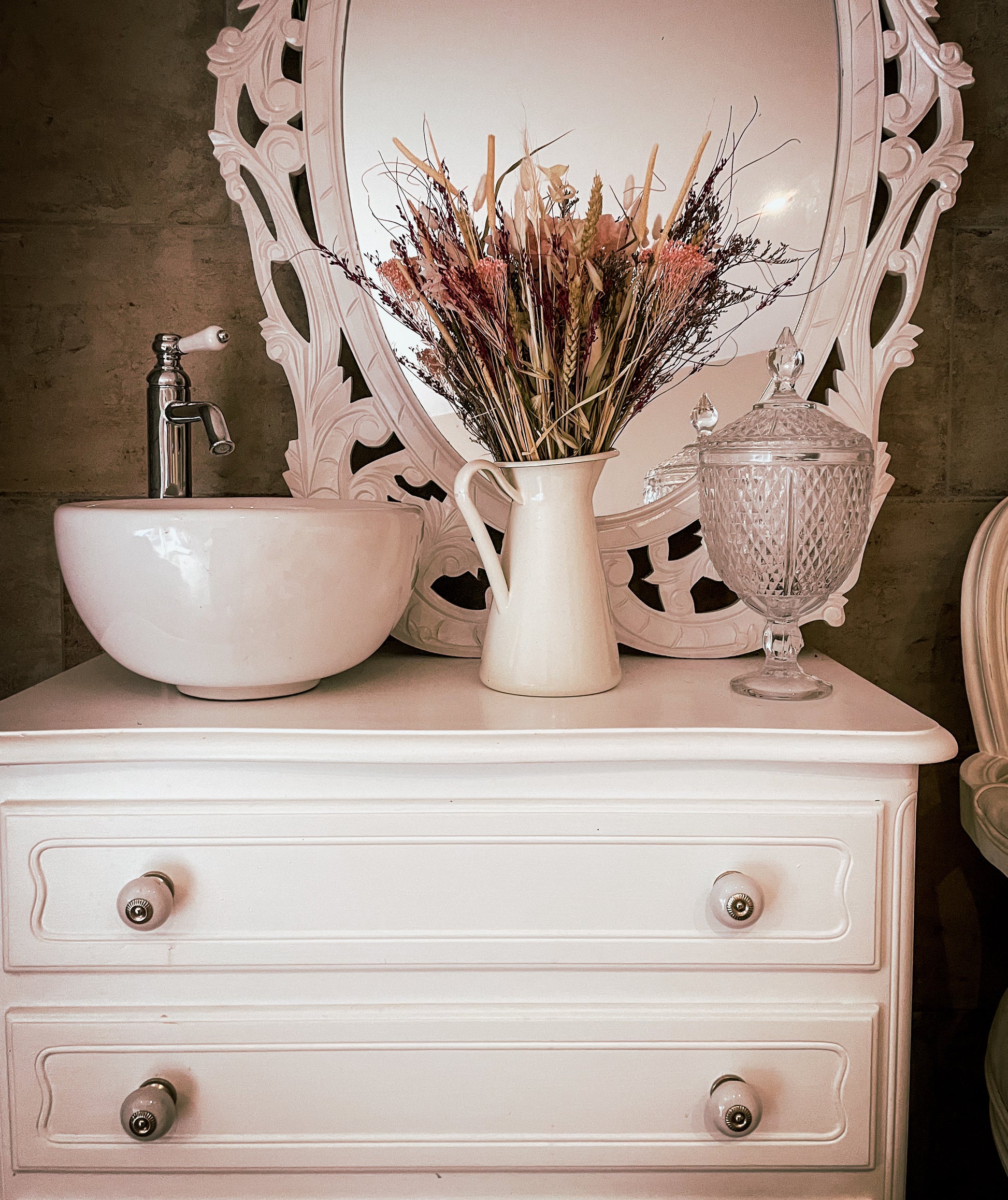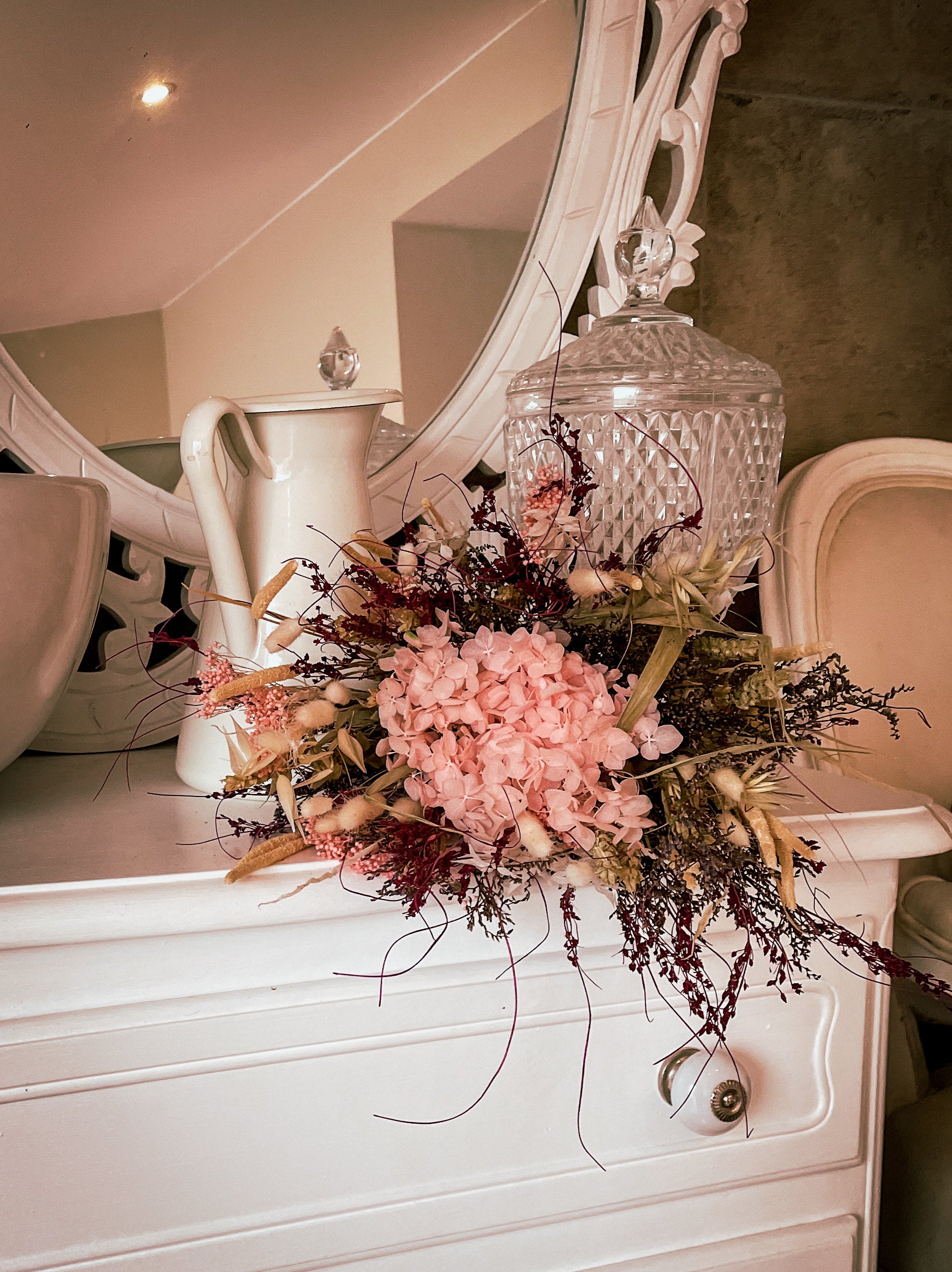 Saï thong, lagurus, broom bloom et hortensia stabilisé pour un bouquet de fleurs séchées aux camaïeu de rose .