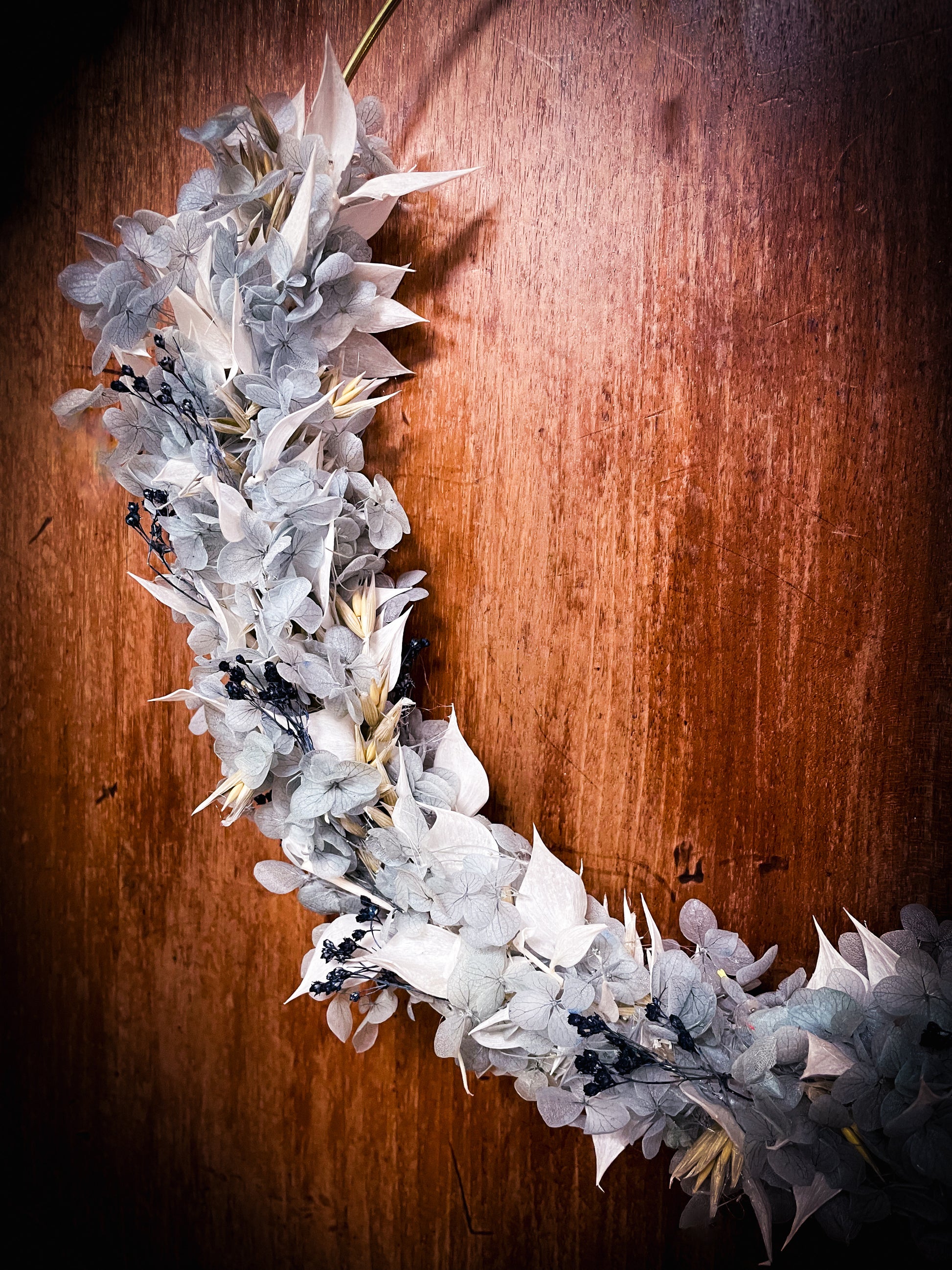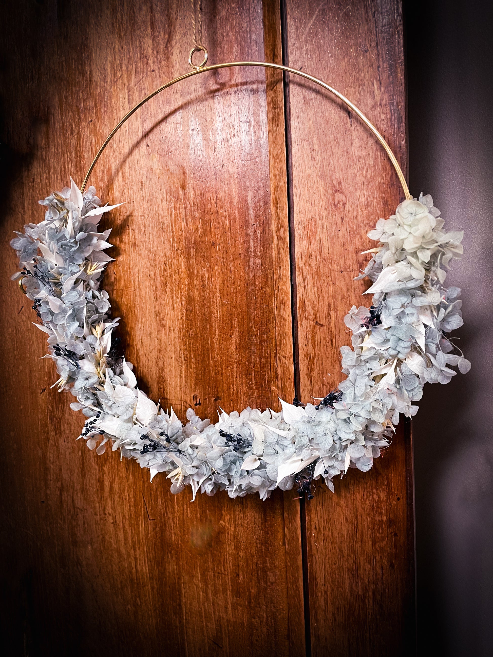 Hortensia bleu, ruscus blanc, broom bloom composé cette couronne murale de fleurs séchées aux teintes hivernales.
