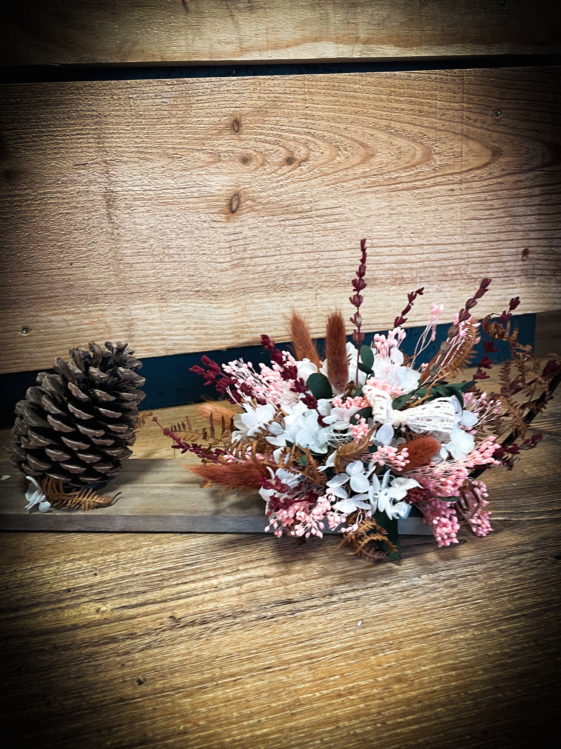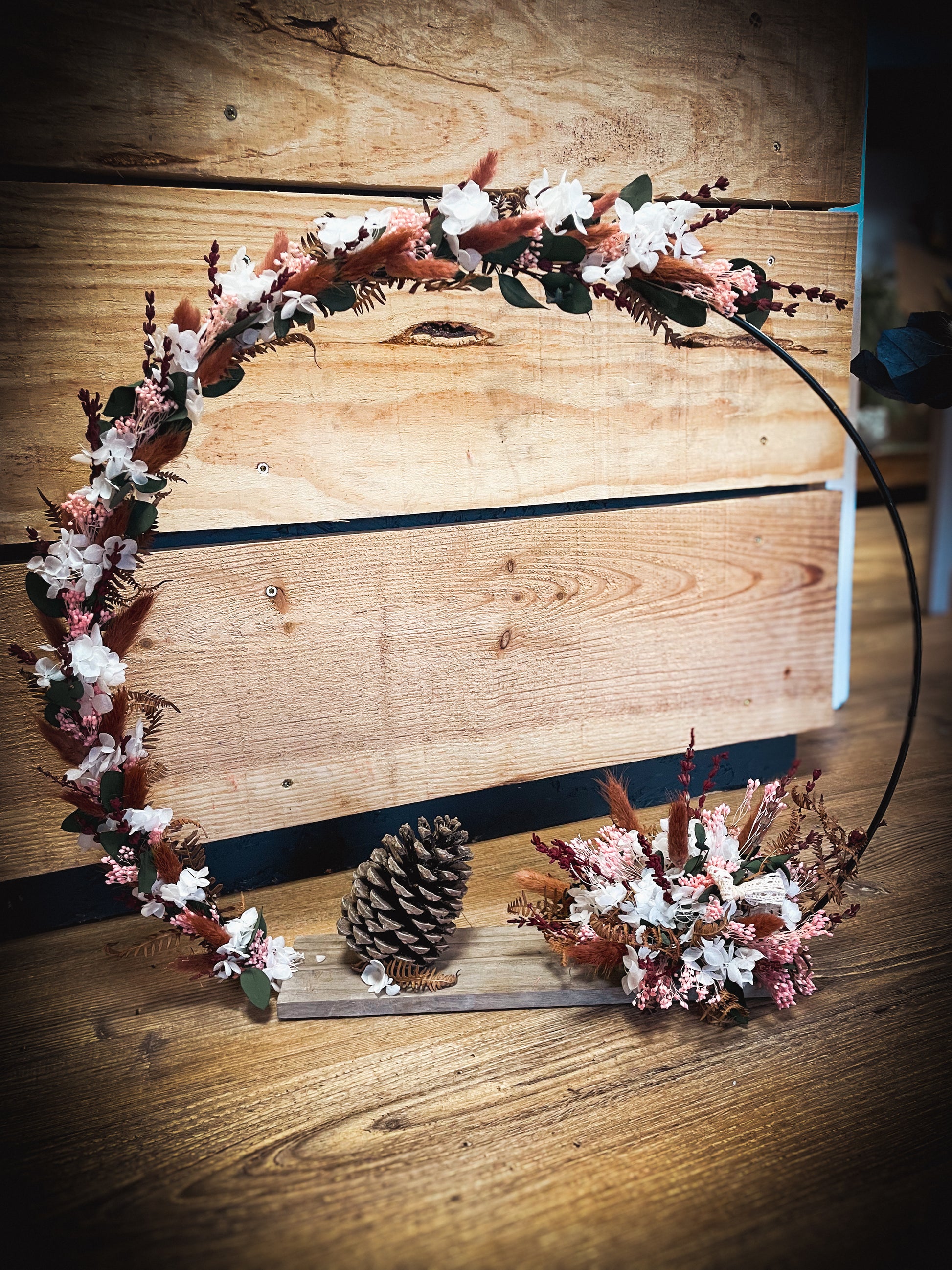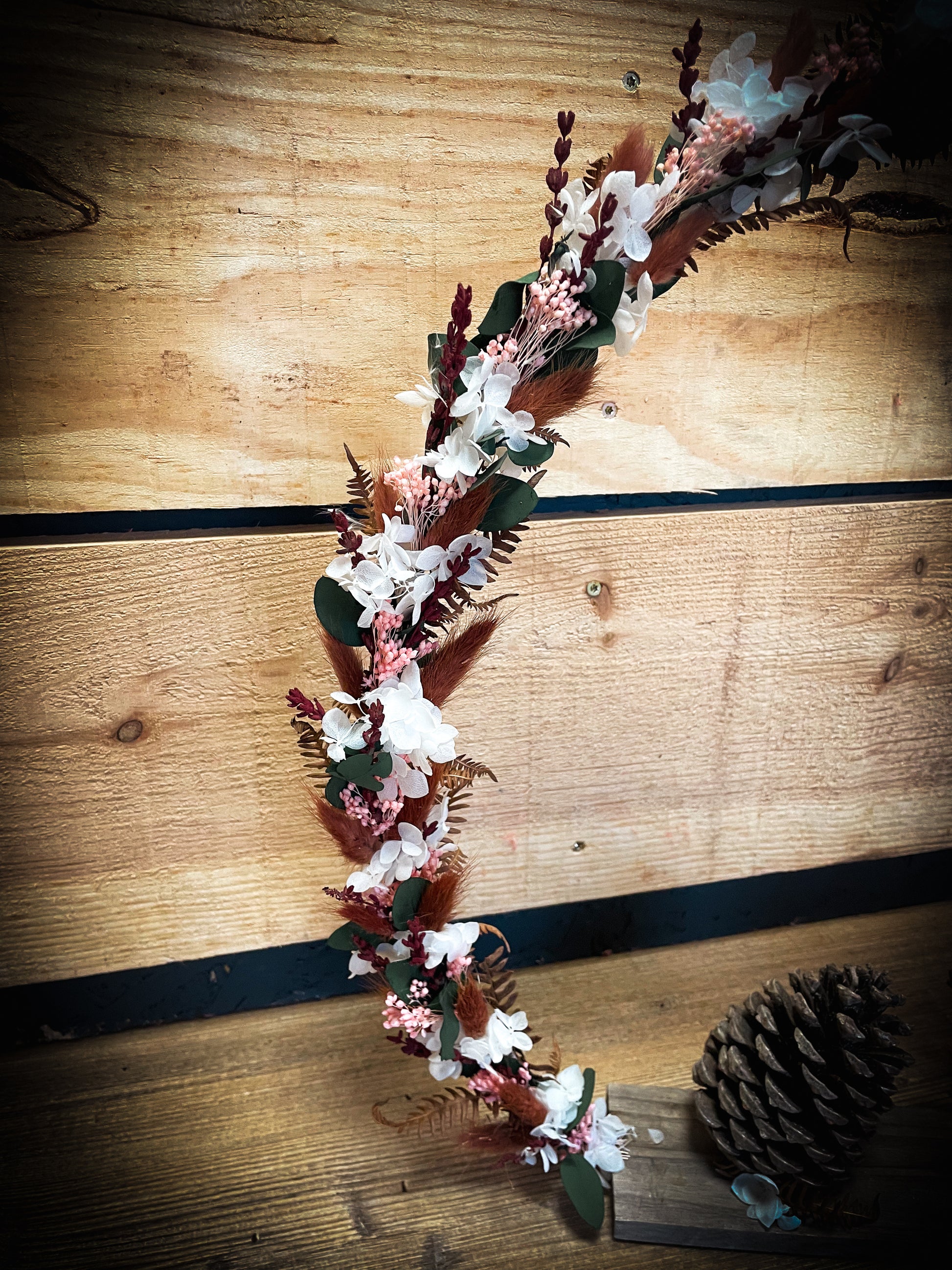 Phalaris brun, hortensia blanc et broom bloom rose sont les pièces maîtresse de cette couronne de fleurs séchées à l’allure d’une Forêt enchantée.