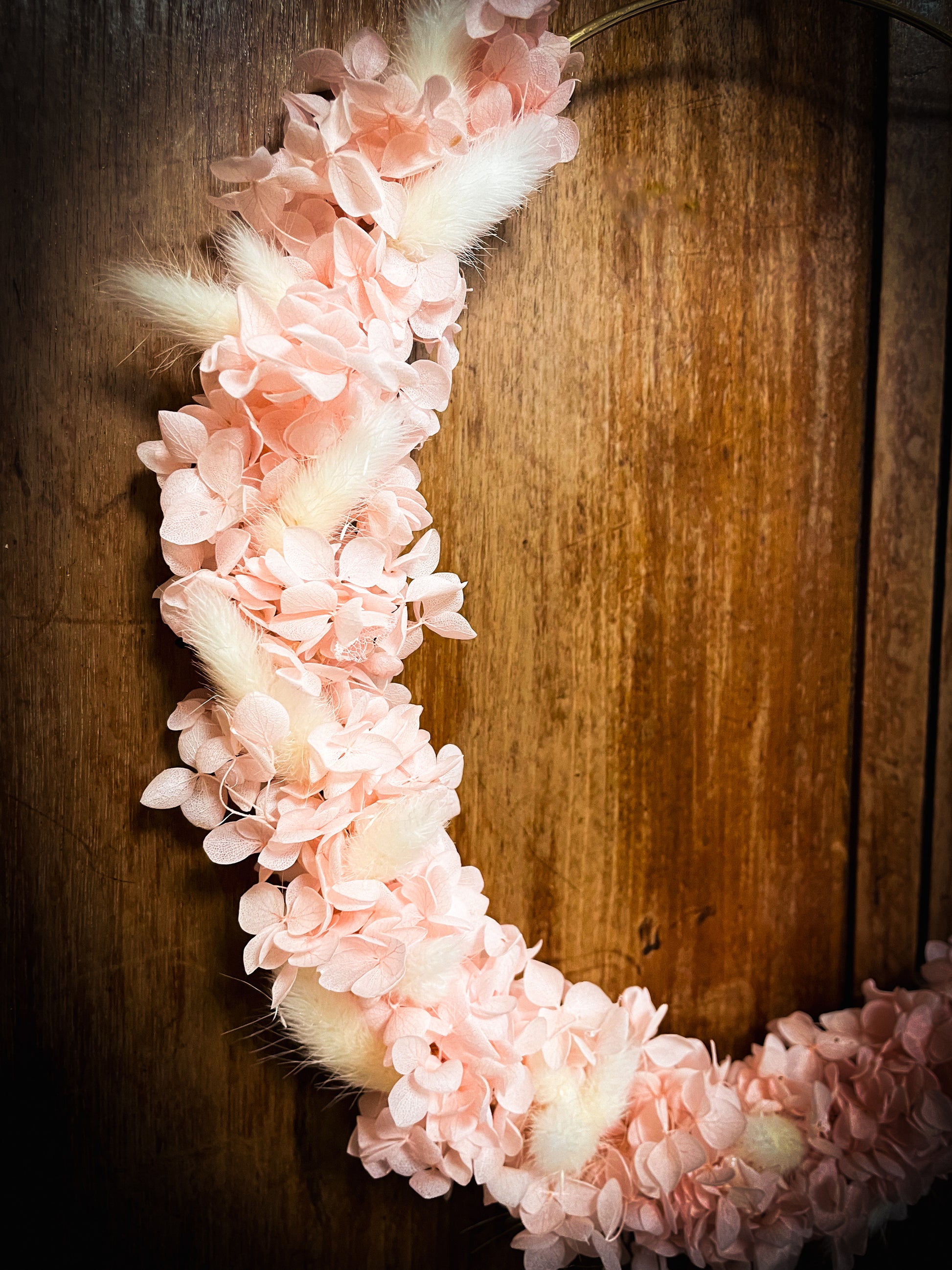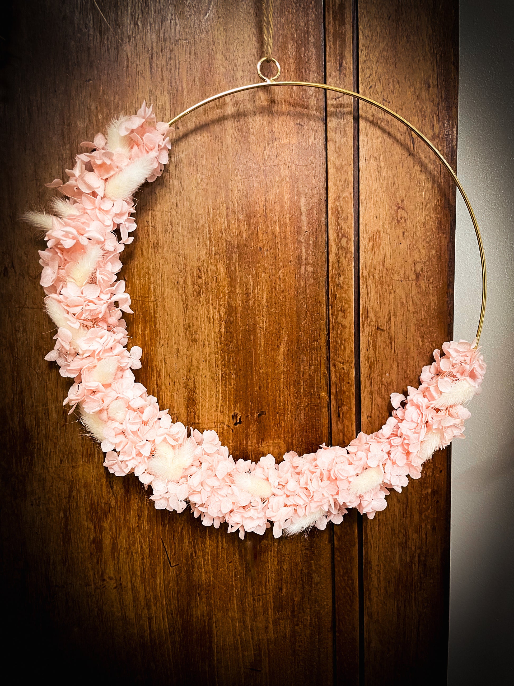 Hortensia rose et lagurus blanc se marient à merveille dans cette couronne de fleurs séchées pour un résultat lumineux et délicat.