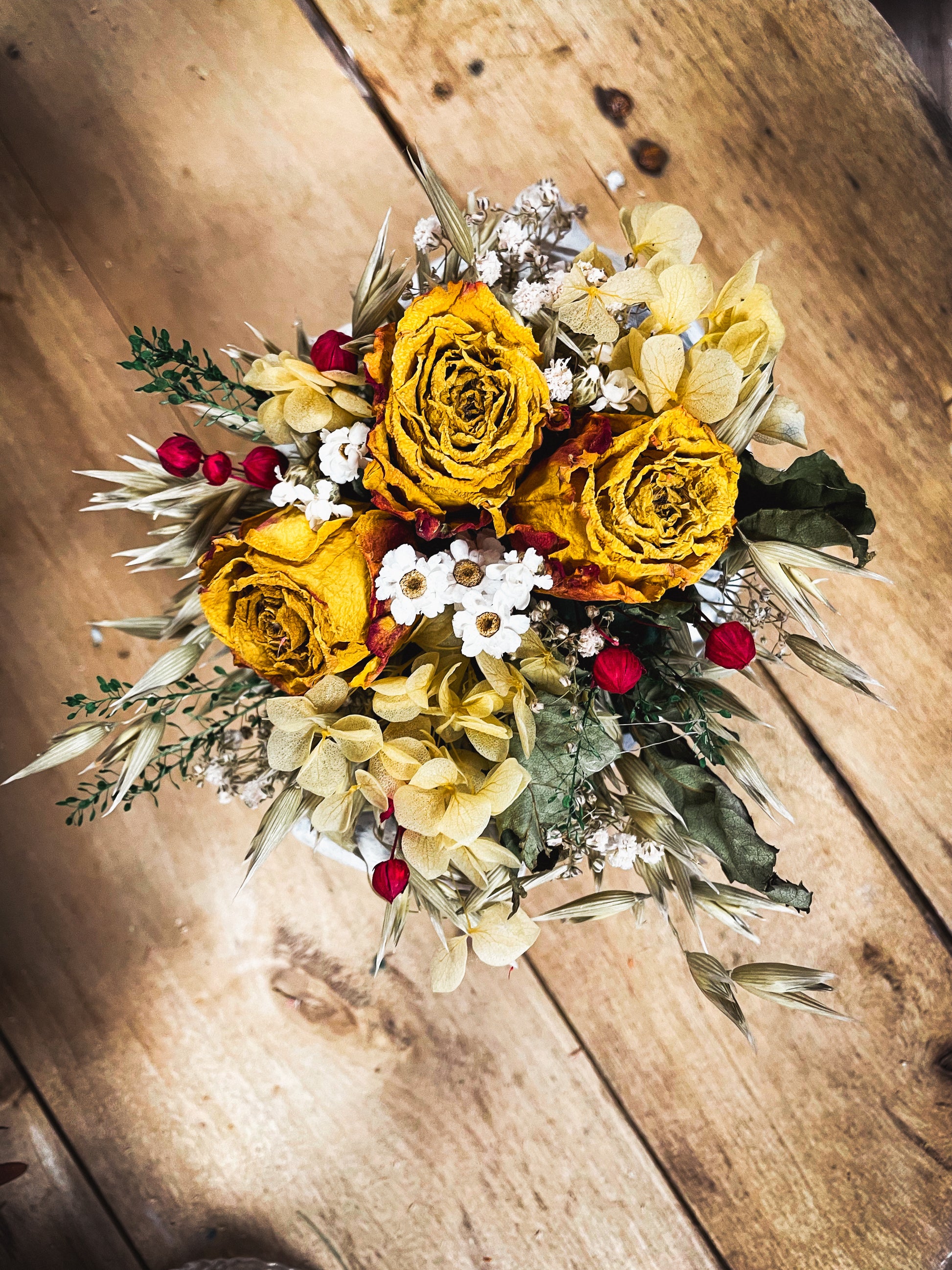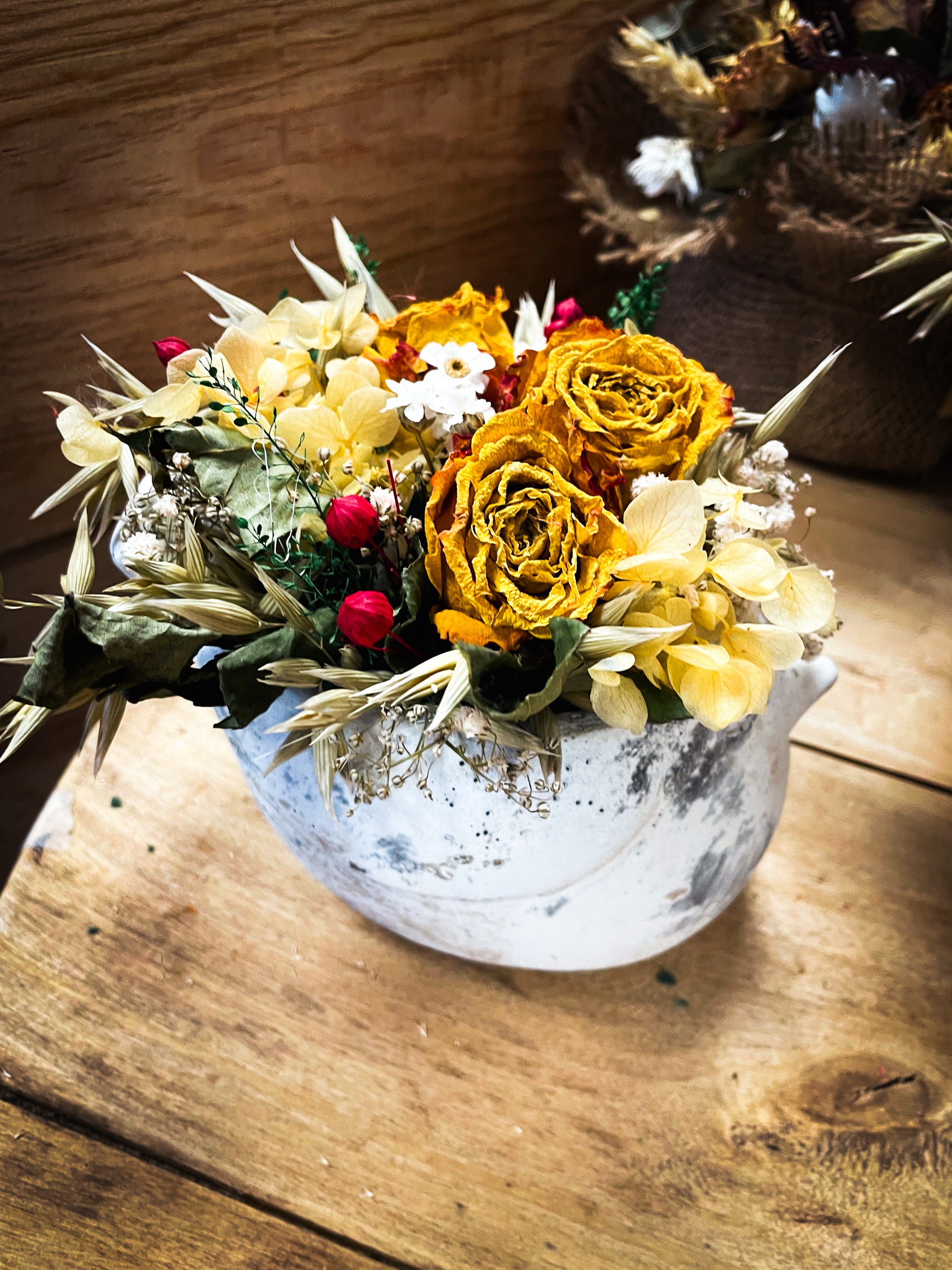 Composition de fleurs séchées et son pot petit oiseau